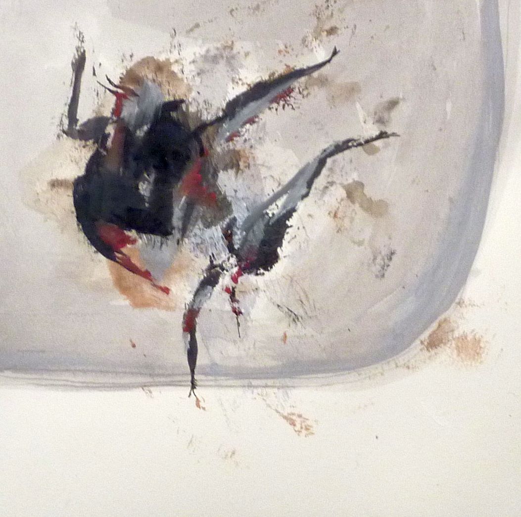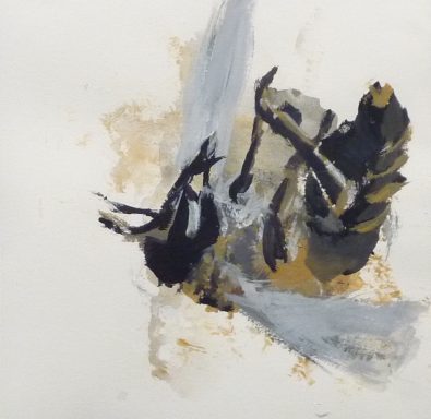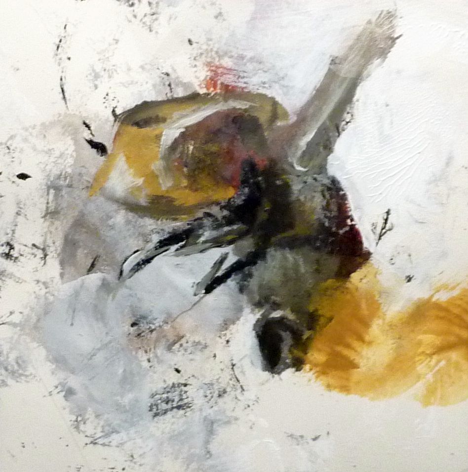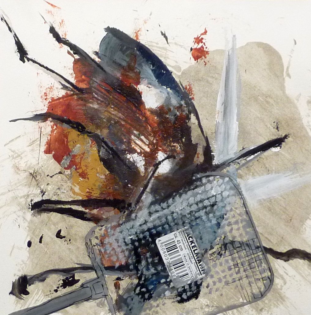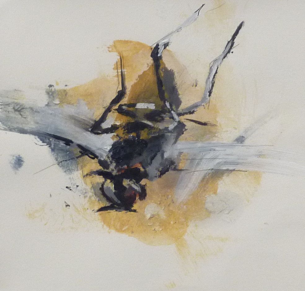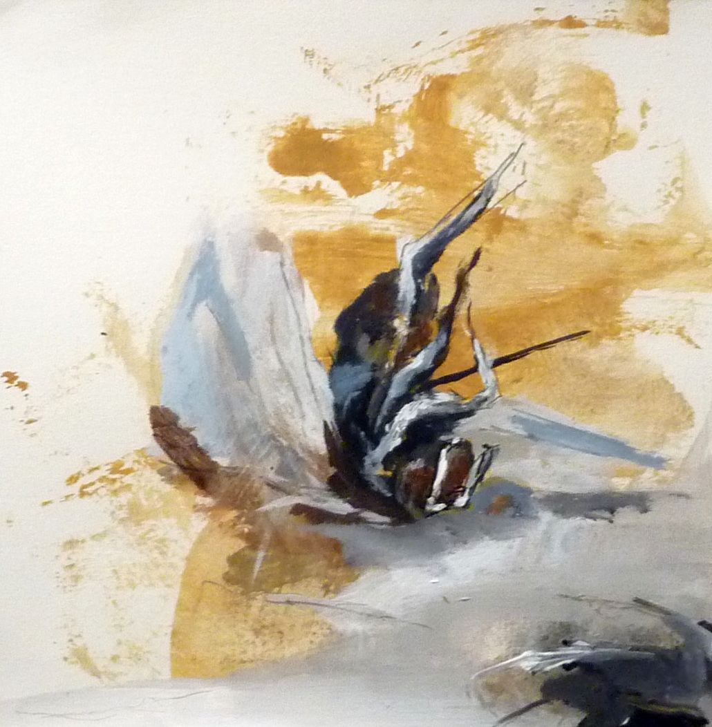 Auch in dieser fortlaufenden Serie, begonnen im Jahr 2013, untersuche ich die fragile Grenze zwischen Gegenständlichkeit und Abstraktion. Die Werke bewegen sich im Spannungsfeld von Anziehung und Abstoßung, von Schönheit und Grauen. Durch den Einsatz von Acryl und zum Teil Collagematerial auf kleinformatigen Papieren (20 x 20 cm) entstehen verdichtete Bildräume, in denen Formen zwischen Erkennen und Auflösen changieren. Morbidität und Ästhetik verbinden sich in einem malerisch-skizzenhaften Duktus mit grafischen Elementen und Collage.